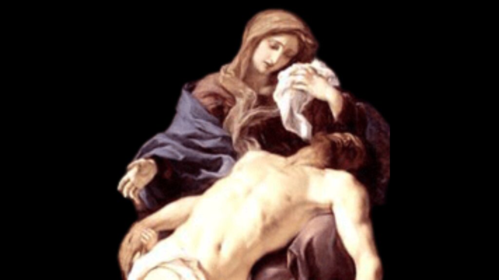 Mãe Dolorosa, vejo que beijas os Olhos fechados de Jesus e sofro ao ver que Jesus não olha para Ti. Quantas vezes, Seus olhares Te enchiam de Paraíso e Te faziam passar da morte à vida, e agora, vendo que não mais Te olha, te sentes morrer! Por isso, nos olhos de Jesus deixas os Teus e fazes Teus os Seus, as Suas lágrimas e amarguras ao ver as ofensas das criaturas, os inumeráveis insultos e desprezos.